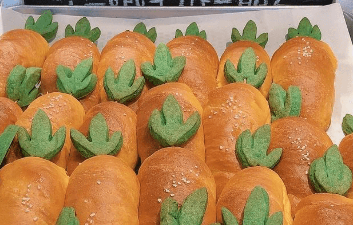 귀여운 당근처럼 생긴 이 소금빵은 마치 당근 모양처럼 생겨서 더욱 인기가 많다고 해요! 그냥 소금빵도 너무 맛있어 보이는데 기왕이면 귀여운걸 사고싶은게 사람마음이죠~