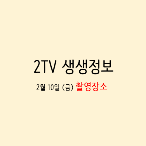 KBS 2TV 생생정보 방송은 한국인이 가장 많이 보는 저녁정보 프로그램으로 잘 알려져있으며 대한민국 구석구석의 살아 움직이는 생생한 현장은 물론 맛있는 음식 정보와 웃음과 감동을 선사하는 휴먼스토리, 유익하고 재미있는 알찬 정보까지! 우리 주변의 궁금한 이야기를 진솔하고 생생하게 담아 시청자들에게 유쾌한 저녁을 선사한다.대표적으로 미스터Lee의 사진한컷 대한민국, 택시맛객, 이PD가간다 등 다양한 요일별 코너를 통해 수많은 애청자들을 낳은 장수프로그램입니다. 매일 전국에 위치한 맛집과 제철음식 가족, 친구, 연인과 떠나기 좋은 관광지를 소개하며 큰 사랑을 받고 있습니다. 금일 방송을 통해 소개된 촬영장소는 아래쪽 링크(바로가기)를 통해 확인할 수 있습니다.