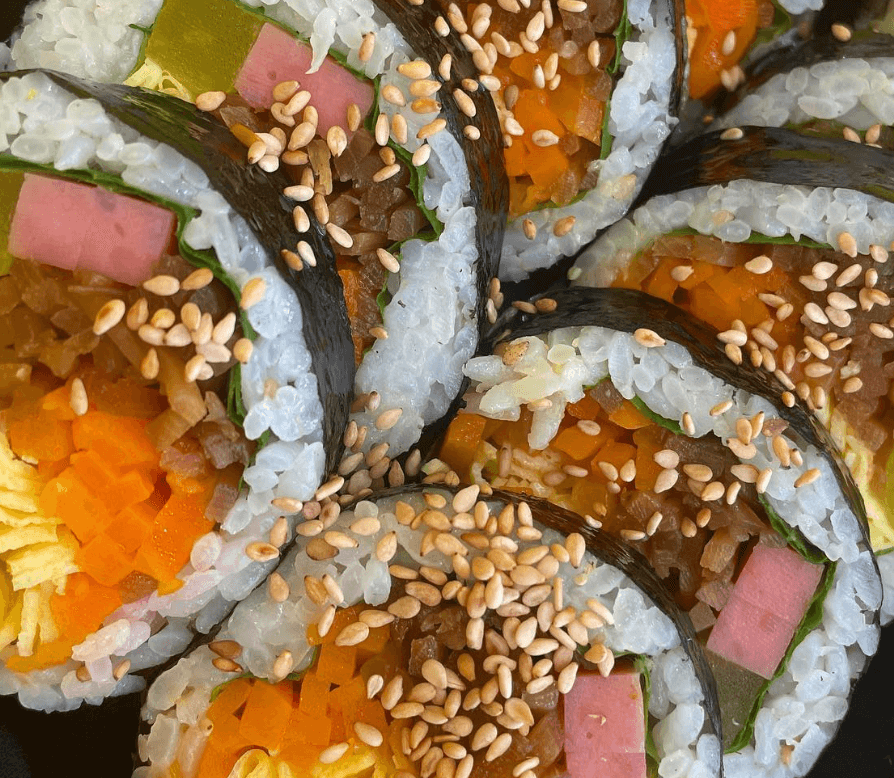달걀김밥 하면 떠오르는 건 보통 얇은 계란지에 살짝 감싸진 김밥을 떠올리기 쉽지만, 이곳은 한눈에 보기에도 일반적인 스타일과는 다른 특별함이 느껴집니다. 달걀을 두껍고 부드럽게 입혀 부침개처럼 말아낸 이 김밥은 보는 순간부터 입맛을 자극합니다. 내부 재료도 흔히 보는 단무지, 당근, 햄뿐만 아니라 식감을 살려주는 다양한 재료들이 조화를 이루고 있어 식사 대용으로도 손색이 없습니다.